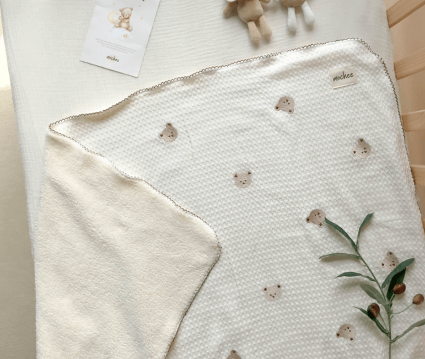 Chăn waffle gấu thêu lót lông vải tổ ong
