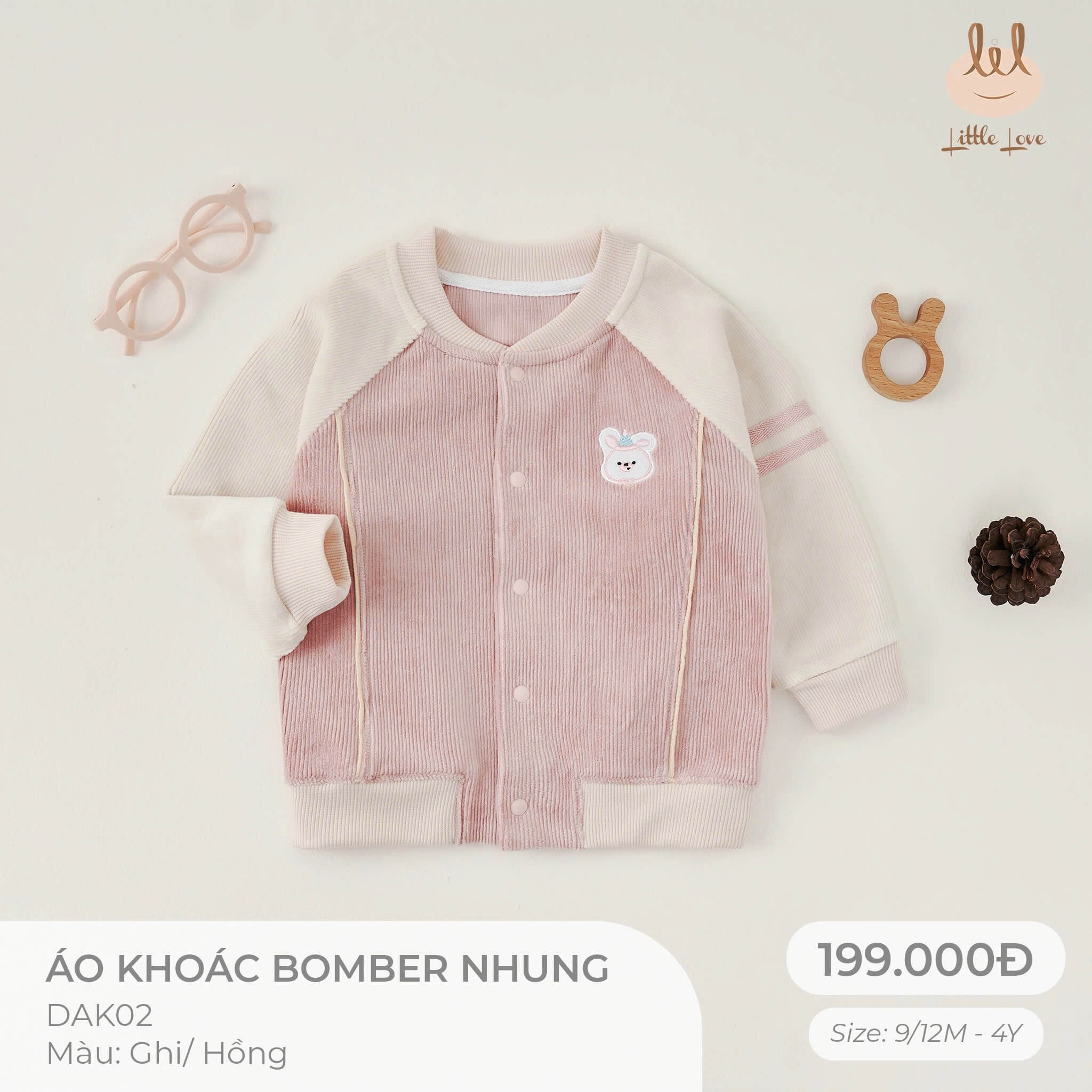 Little Love áo khoác bomber nhung hồng thêu thỏ (3Y,18-24M,12-18M)