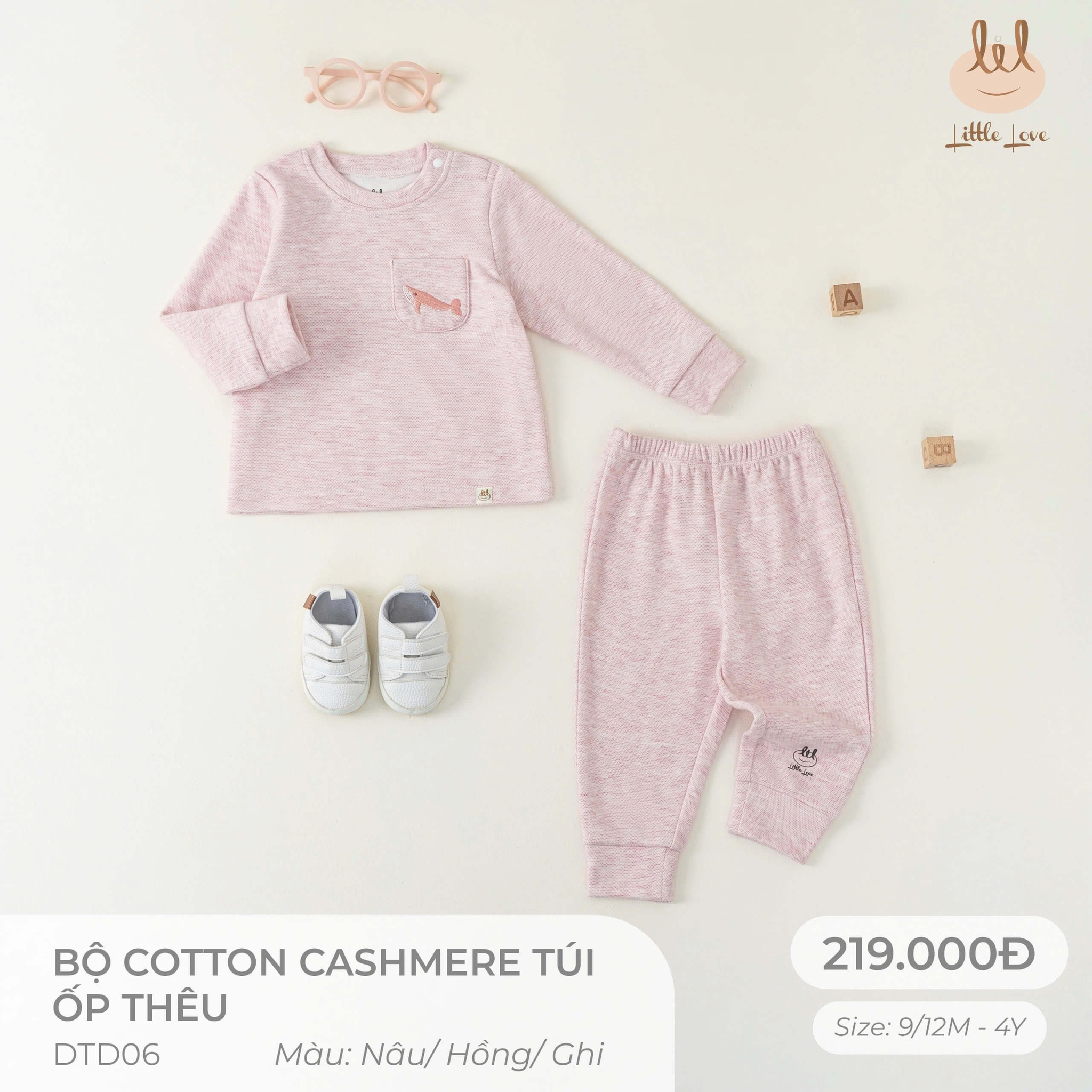 Little Love bộ cotton cashmere túi ốp hồng thêu cá (4Y,3Y,18-24M,12-18M,9-12M)