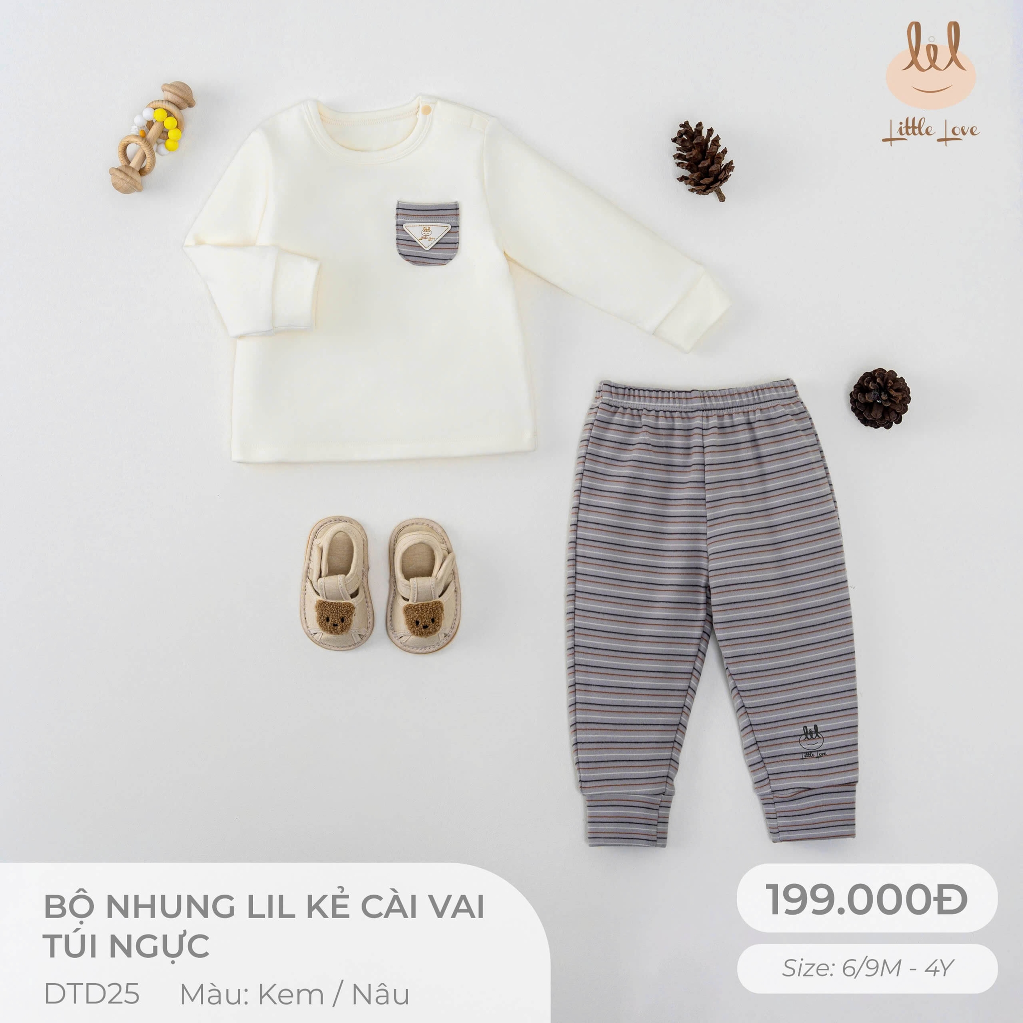 Little Love bộ nhung lil kẻ cài vai túi ngực kem (3Y,18-24M,12-18M,9-12M,6-9M)