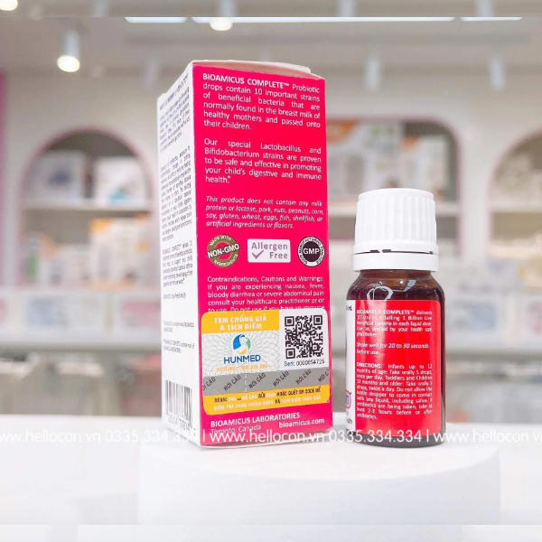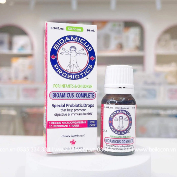 Men vi sinh 10 chủng Bioamicus Complete là sản phẩm được nhập khẩu nguyên chai đến từ Canada. Đây là sản phẩm được ví như một hệ vi sinh đường ruột thu nhỏ cùng công thức đột phá chứa 10 chủng lợi khuẩn cần cho đường ruột của trẻ. Chỉ cần sử dụng từ 5-10 giọt trong một ngày sẽ giúp bé con của bạn cải thiện được tình trạng biếng ăn, kém hấp thụ hay rối loạn tiêu hóa một cách hiệu quả. Sản phẩm hiện có bán tại Hellocon.vn.