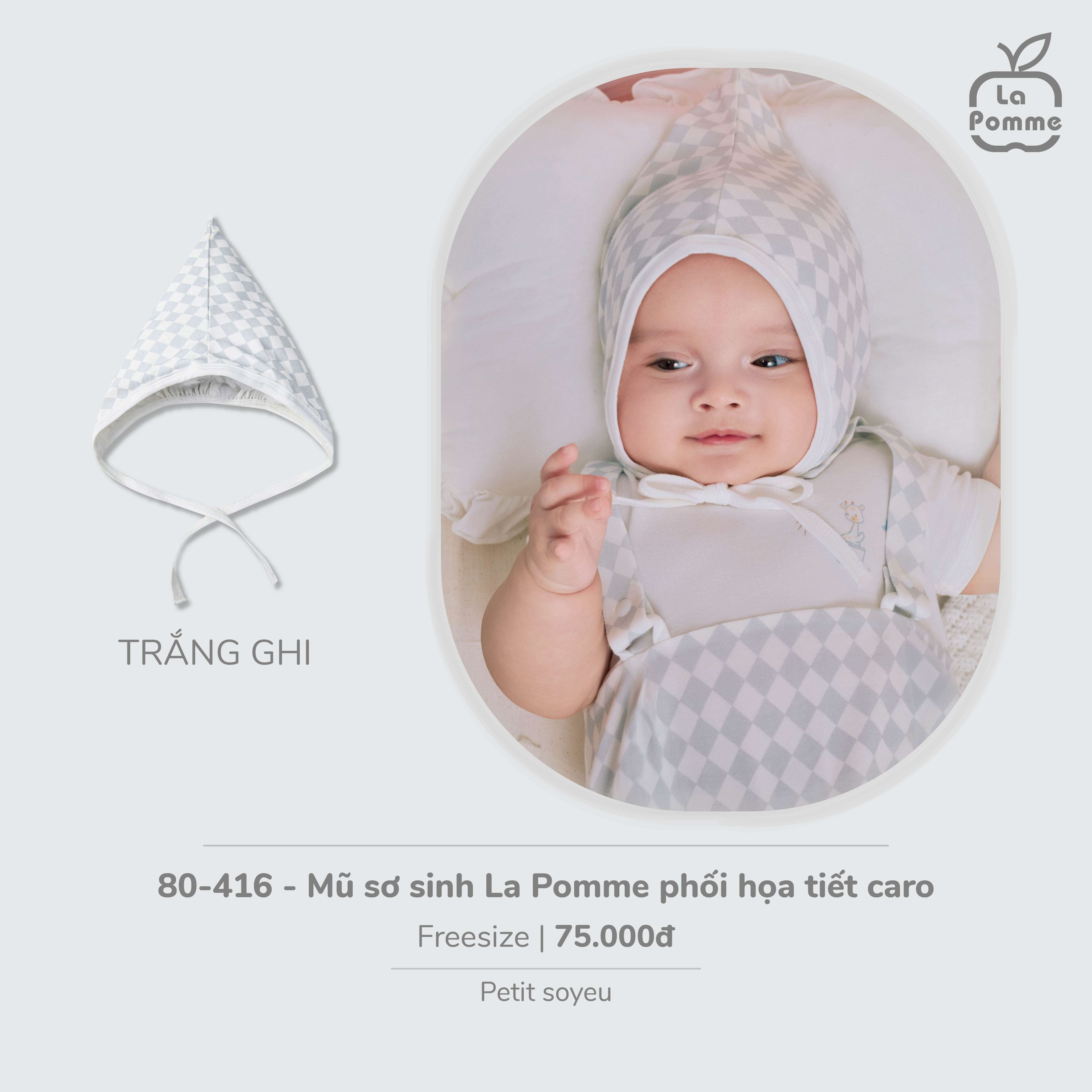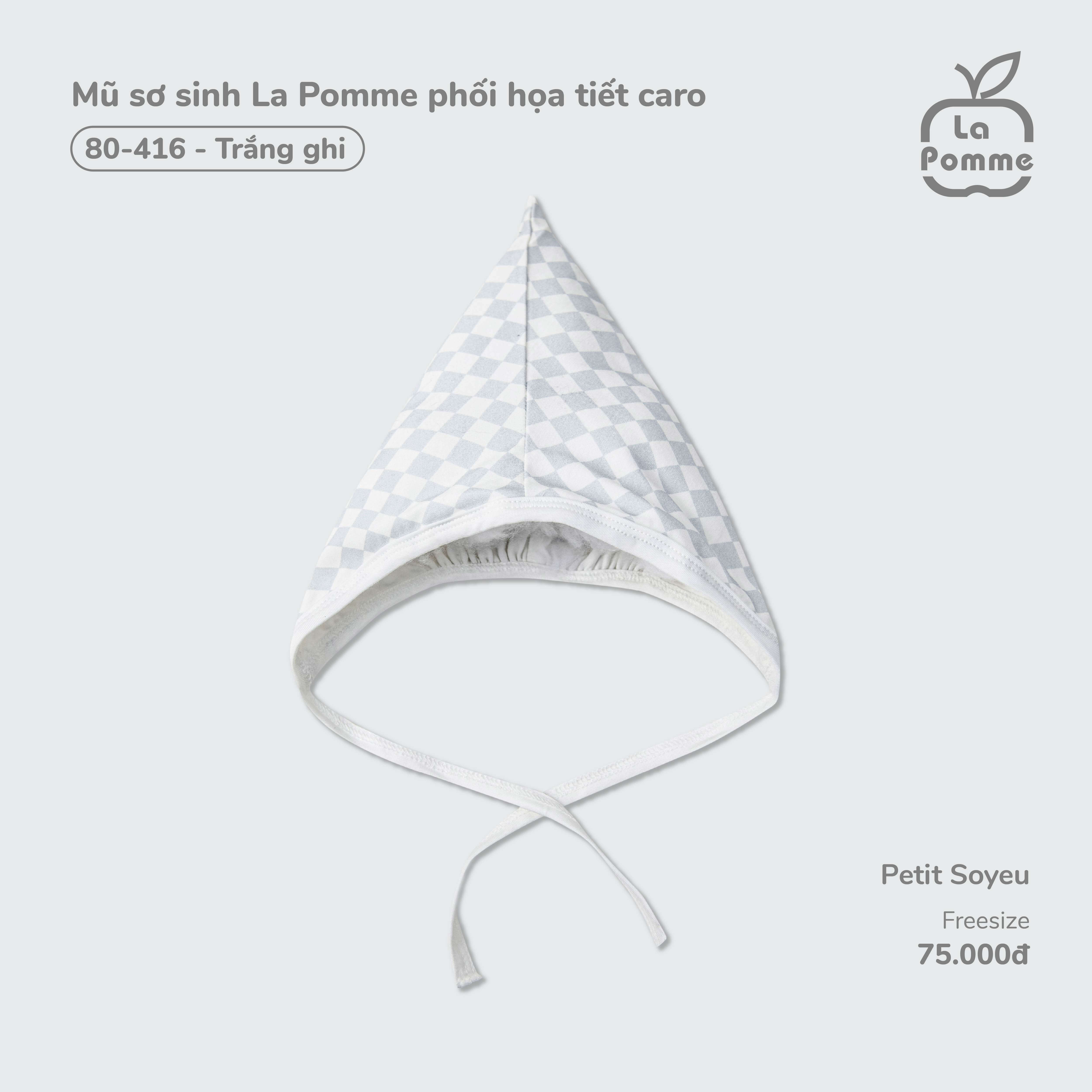 Mũ sơ sinh La Pomme phối họa tiết caro - Trắng Ghi