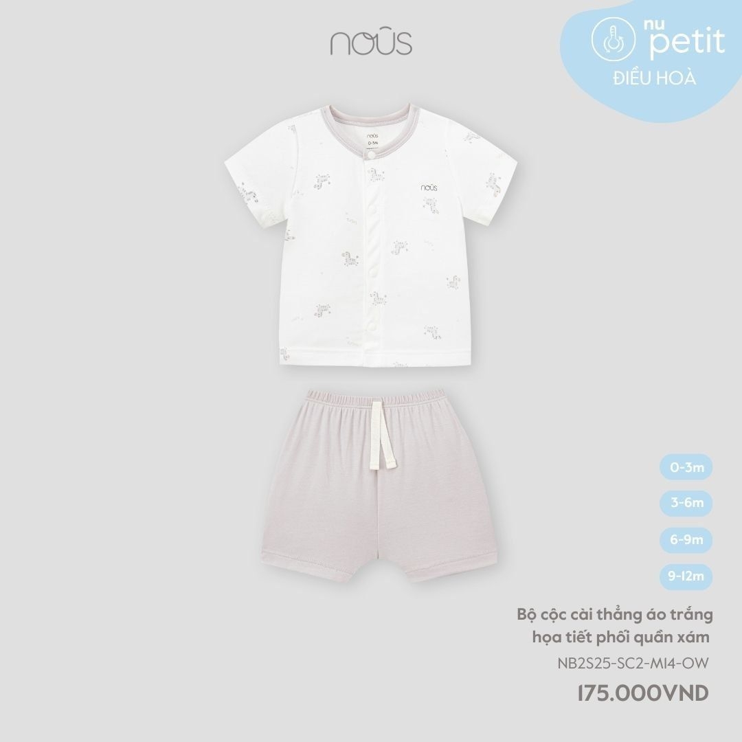 Nous Bộ cộc cài thẳng áo trắng họa tiết phối quần xám 6,9M