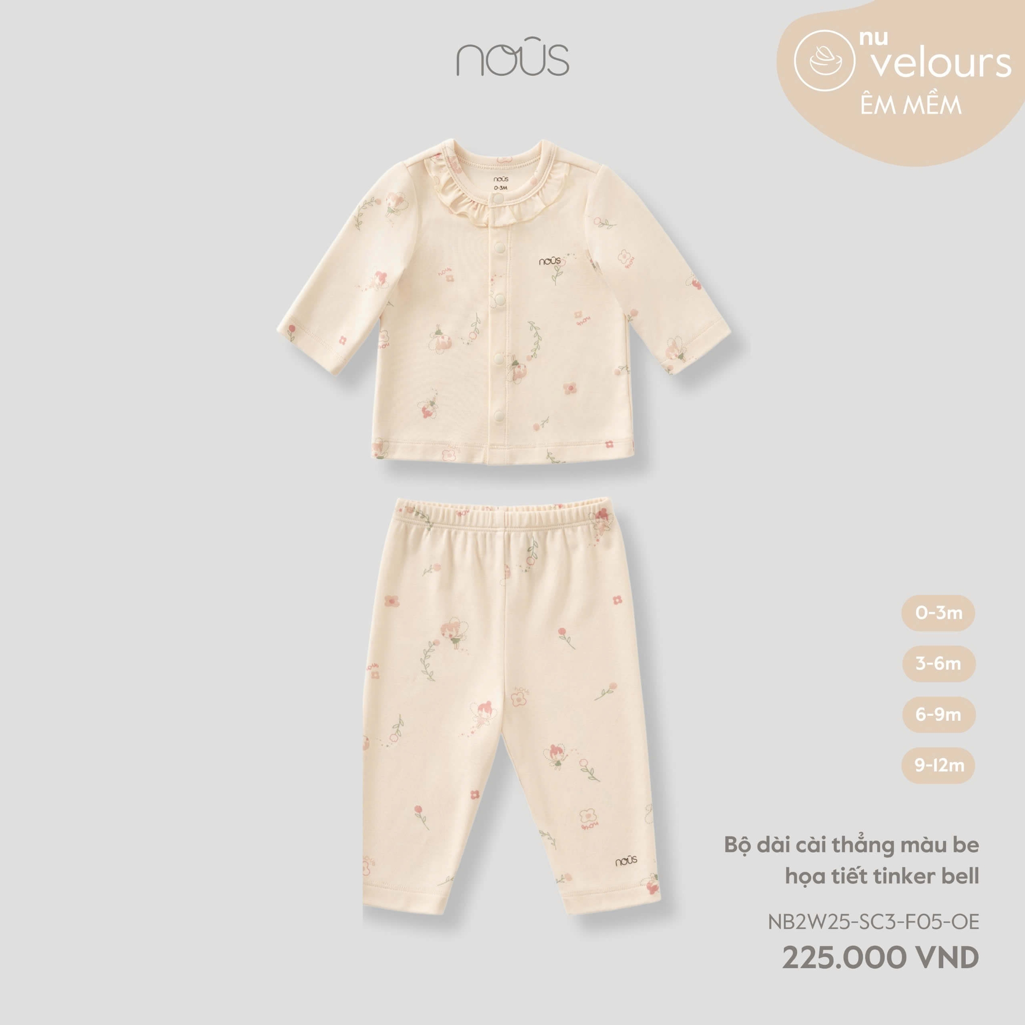 Nous Bộ dài cài thẳng màu be họa tiết tinker bell 0,3,6,9M