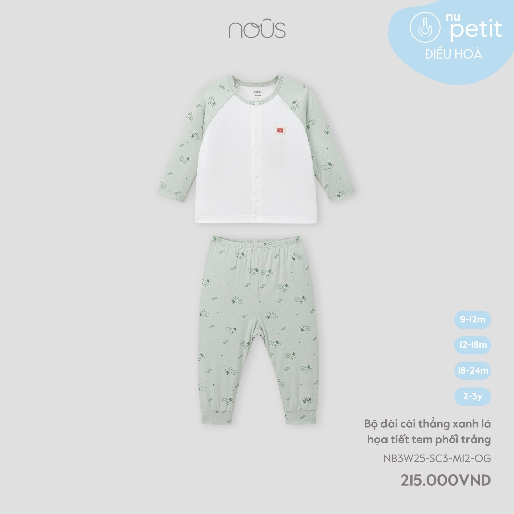 Nous Bộ dài cài thẳng xanh lá họa tiết tem phối trắng 9,12,18M,2Y