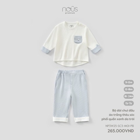 Nous Bộ dài chui đầu áo trắng thêu sóc phối quần xanh da trời 2Y