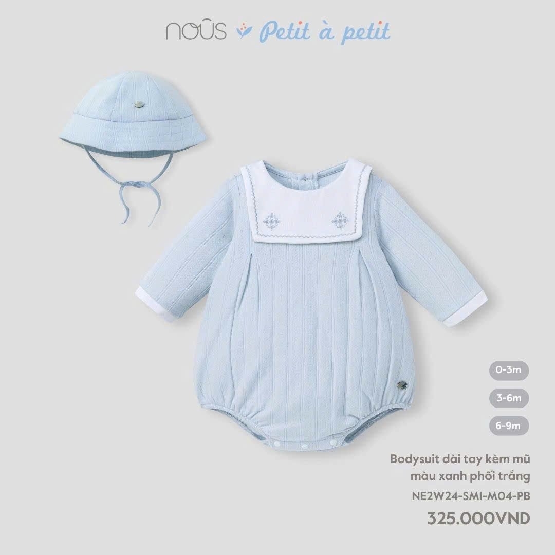 Nous - Bodysuit dài tay kèm mũ màu xanh phối trắng 0,3,6M