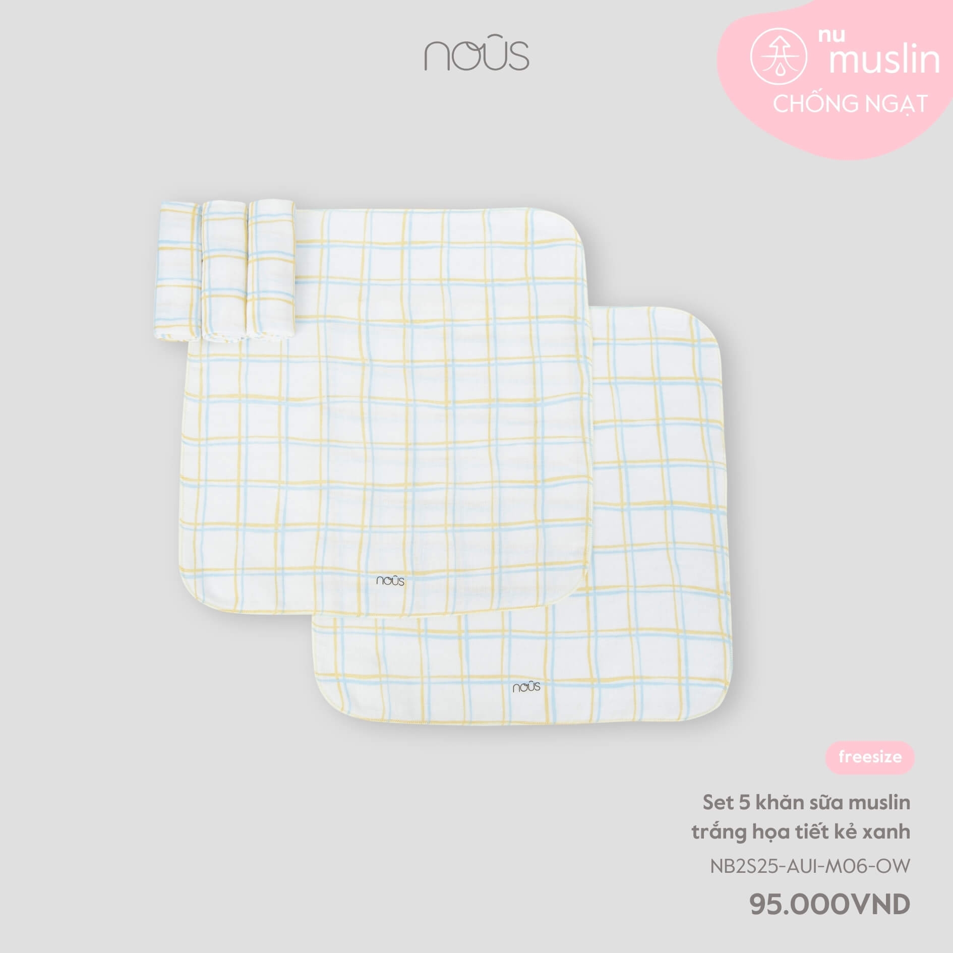 Nous Set 5 khăn sữa muslin trắng họa tiết kẻ xanh