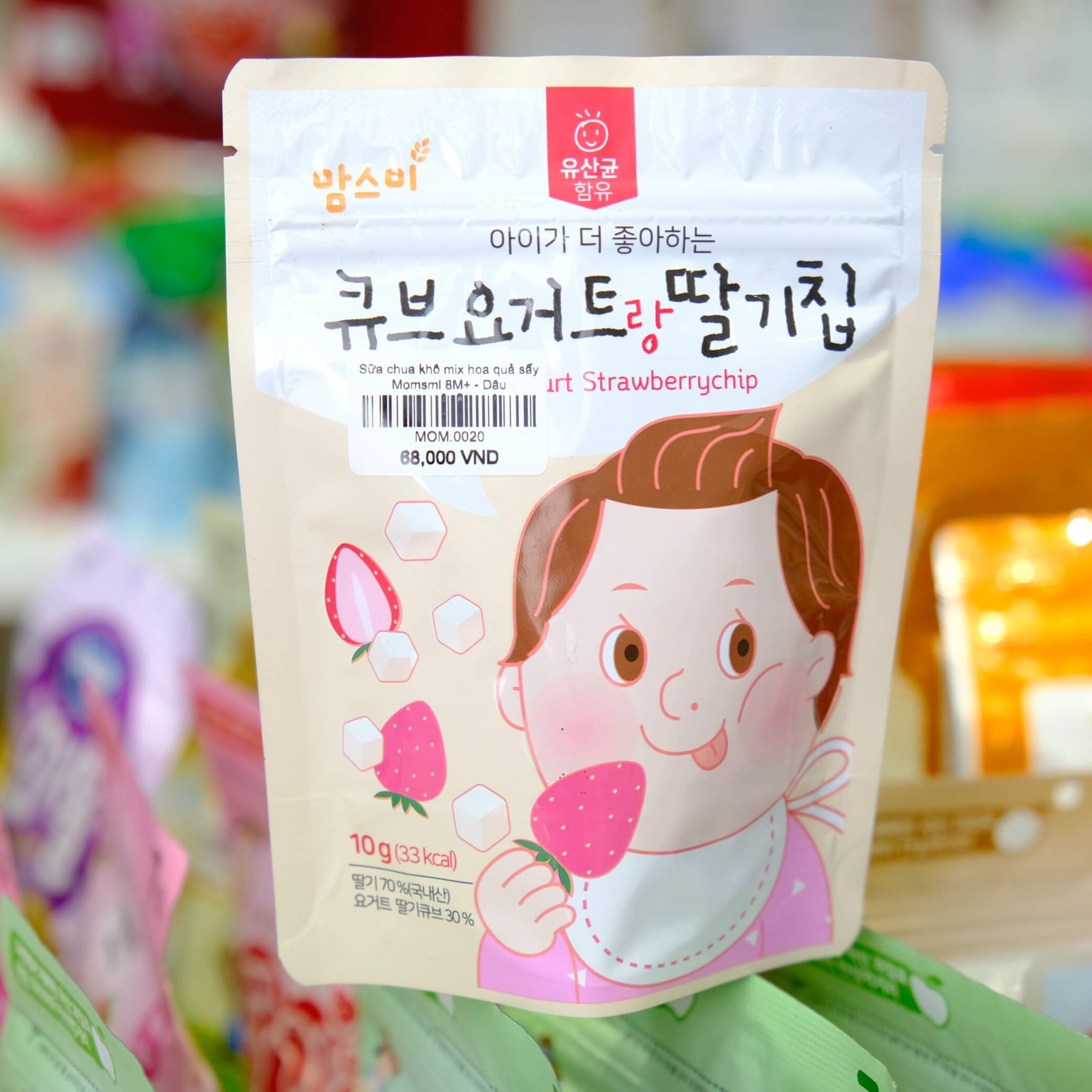 Sữa chua khô Momsmi là một trong những thực phẩm ăn dặm được nhiều mẹ bỉm lựa chọn để bổ sung canxi cho trẻ từ 8 tháng. Sữa chua khô Momsmi được sản xuất bằng công nghệ sấy lạnh hiện đại của Hàn Quốc giúp giữ tối đa dinh dưỡng bên trong sữa chua và trái cây. Sử dụng sữa chua khô Momsmi rất mềm và dễ tan trong miệng nên các bé rất thích, cha mẹ cũng không lo bé bị hóc khi ăn.
