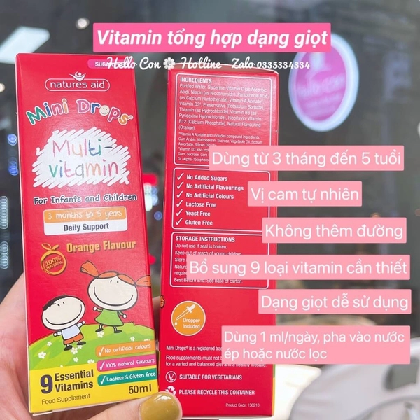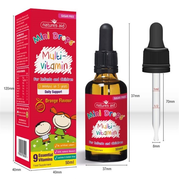 Sản phẩm có tên đầy đủ là Natures Aid Mini Drops Multivitamin, được nghiên cứu và sản xuất tại Anh Quốc. Đây là một loại vitamin tổng hợp cho bé biếng ăn được nhiều mẹ trên thế giới tin dùng trong những năm tháng đầu đời của con. Sản phẩm có quy cách đóng gói 50ml/lọ nên có thể sử dụng được rất lâu.